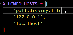 settings.py 파일에서 아래와 같이 ALLOWED_HOSTS 파일을 수정해준다.